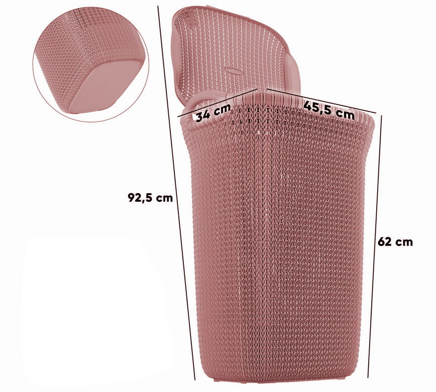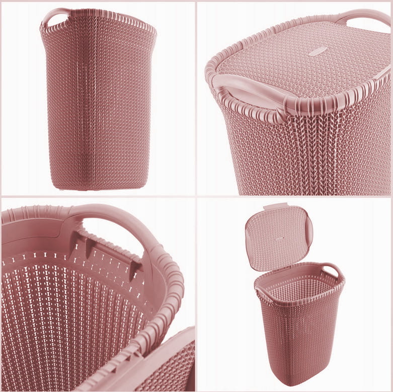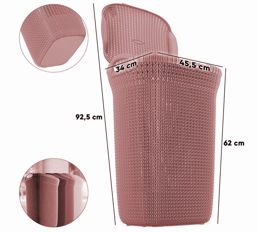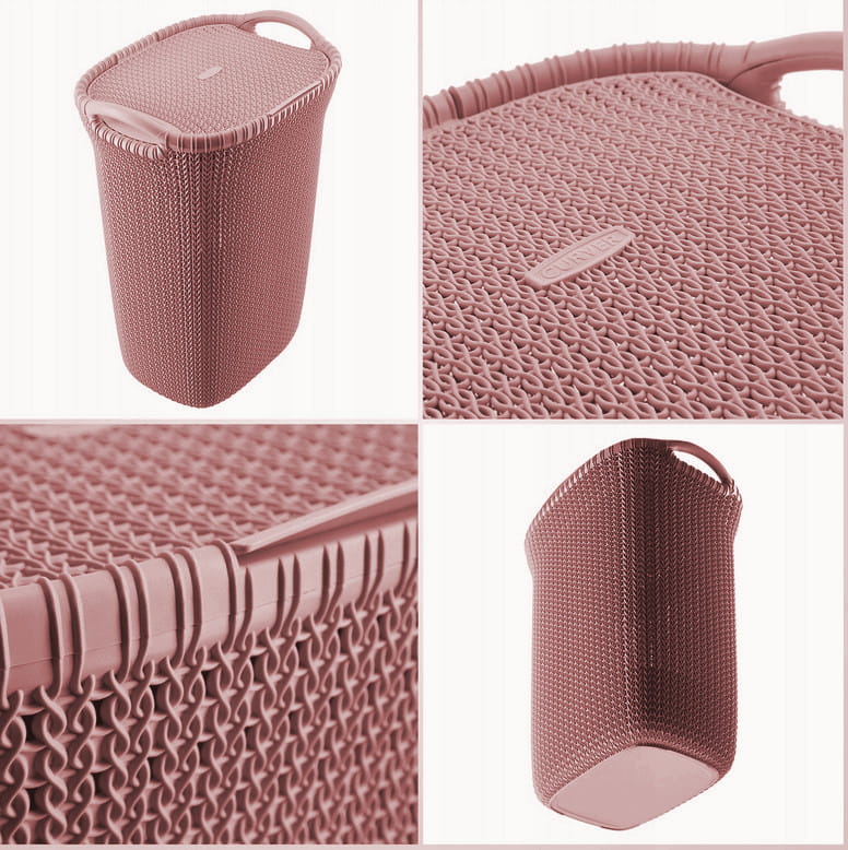 Kosz wyróżnia się charakterystyczną fakturą imitującą dziergany splot, dzięki czemu prezentuje się wyjątkowo estetycznie i doskonale komponuje się zarówno z nowoczesnymi, jak i klasycznymi wnętrzami. Delikatny różowy kolor nadaje mu subtelnego uroku i sprawia, że stanowi efektowny element wyposażenia łazienki lub pralni.