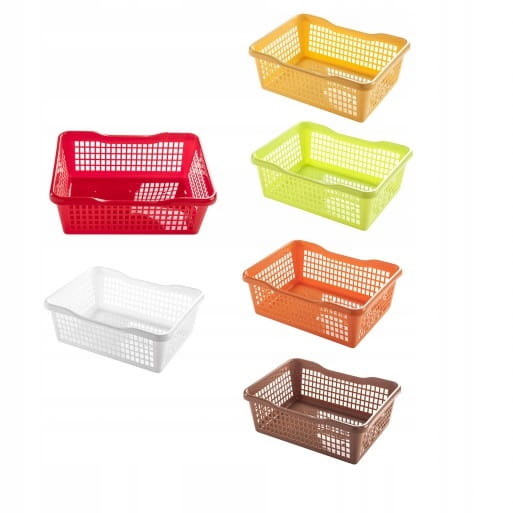 Nasz czerwony koszyk o wymiarach 35,5 x 26,5 x 13 cm to idealne rozwiązanie! Wykonany z wytrzymałego tworzywa sztucznego, jest lekki, łatwy w czyszczeniu i odporny na uszkodzenia. Ażurowa konstrukcja zapewnia odpowiednią cyrkulację powietrza, co jest szczególnie ważne w przypadku przechowywania produktów spożywczych.