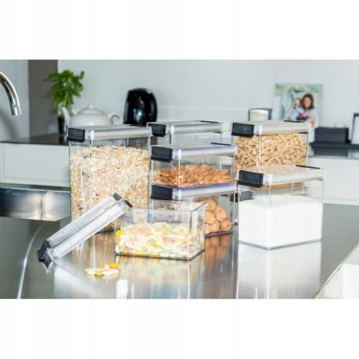 Cechy: Klasyczny pojemnik na suchą karmę z mechanizmem zatrzaskowym, który zapewnia świeżość produktów spożywczych. Kanistry można układać jeden na drugim, a przejrzysta konstrukcja pozwala zobaczyć zawartość zarówno z boku - do przechowywania w kredensie - jak i od góry - do przechowywania szuflady.
