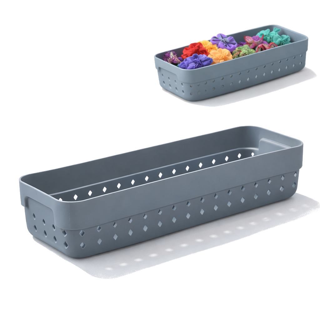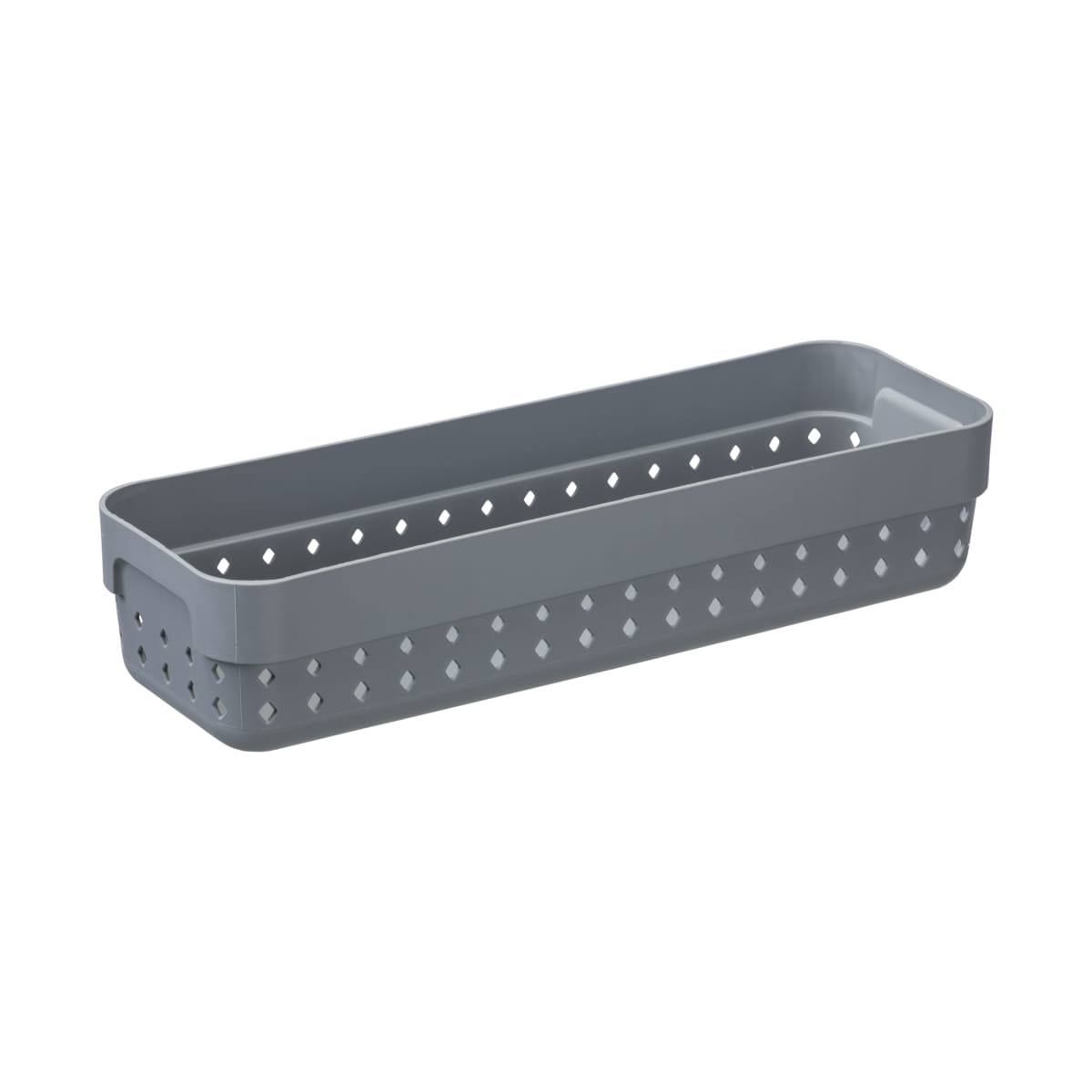 Charakterystyczne otwory w kształcie rombu nadają koszykowi lekkości, a półprzezroczysta forma i matowa powierzchnia podkreślają nowoczesny design. Dodatkowo koszyki można układać w stosy, co pozwala maksymalnie wykorzystać przestrzeń – nawet na małej półce.