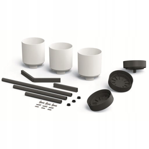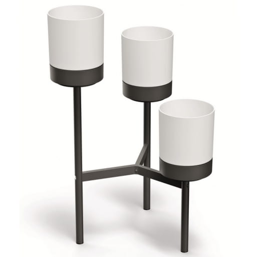 - Trzy proste, eleganckie doniczki z wysokiej jakości tworzywa sztucznego w kolorze białym idealnie komponują się z wytrzymałą metalową ramą w kolorze czarnym.