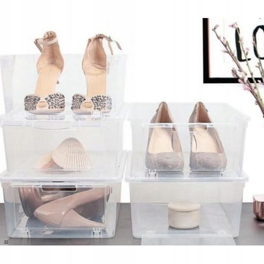 Pojemnik na obuwie BASIC. Praktyczny, transparentny pojemnik z klapką na obuwie jest idealny do każdej szafy i garderoby. Przezroczysty materiał sprawia, że zawartość jest dobrze widoczna. Otwierana klapka pozwala na wyjmowanie butów bez potrzeby zdejmowania innych pojemników z góry. Posiada szczelinę pozwalającą na cyrkulację powietrza. Umożliwia kompleksowe zagospodarowanie całej szafy oraz poprawia jej estetykę wizualną. Na pewno ucieszy każdą miłośniczkę butów. Zestaw takich pojemników w każdej szafie to prawdziwy skarb.