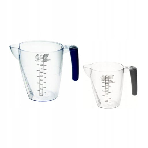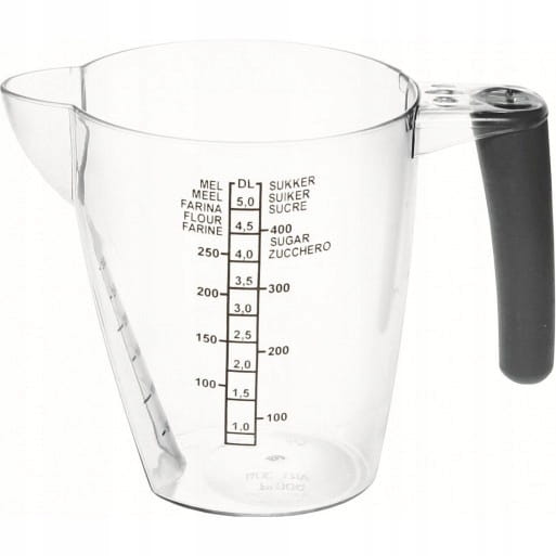 Przezroczysty dzbanek z miarką, dwustronnym nadrukiem skali z przodu (wewnątrz) i z boku do łatwego czytania. Skala w 3. wielkościach, również (decy) litr, dla cukru i mąki w pięciu językach na wszystkich rozmiarach. Otwór do powieszenia i bardzo duża wylewka dla łatwego przelewania