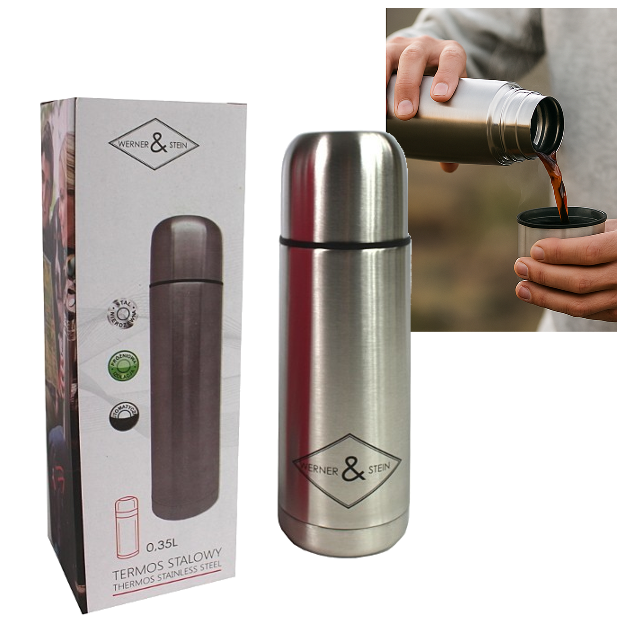Termos stalowy 0,35 l próżniowy z automatycznym korkiem – satynowy