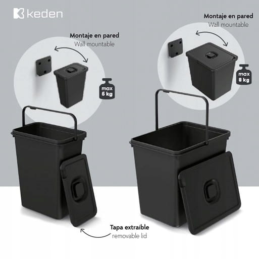 Zestaw zawiera kosz z rączka do łatwiejszego opróżniani oraz pokrywę i wieszak do zaczepienia