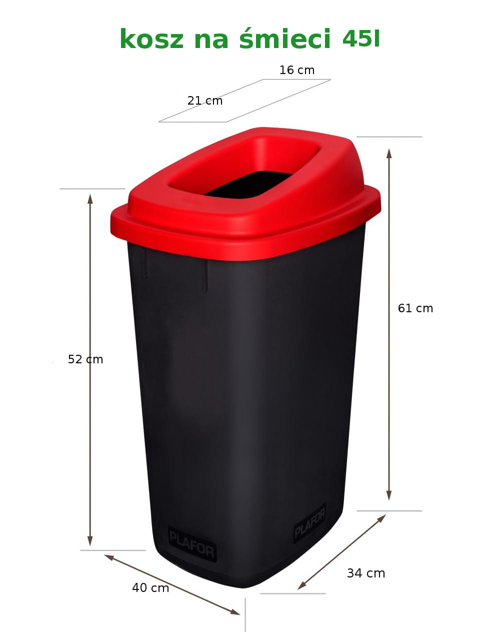 Znakomity nowoczesny kosz przeznaczony do segregowania odpadów. Pojemnik wolnostojący o pojemności 45 litrów, ze zdejmowaną pokrywę z otworem. Kosz na śmieci bardzo praktyczny i łatwy w obsłudze. Produkt wykonany w całości z trwałego tworzywa sztucznego ABS. Istnieje możliwość zastosowania jednorazowych worków na śmieci. Na pojemniku znajduje się naklejka, która informuje jakie odpady powinny znaleźć się w środku kosza.